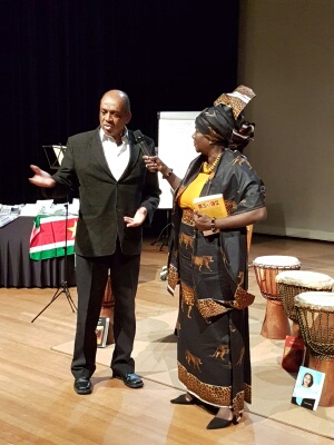 Kwasi Koorndijk neemt boek in ontvangst tijdens presentatie 5de boek Krofaya